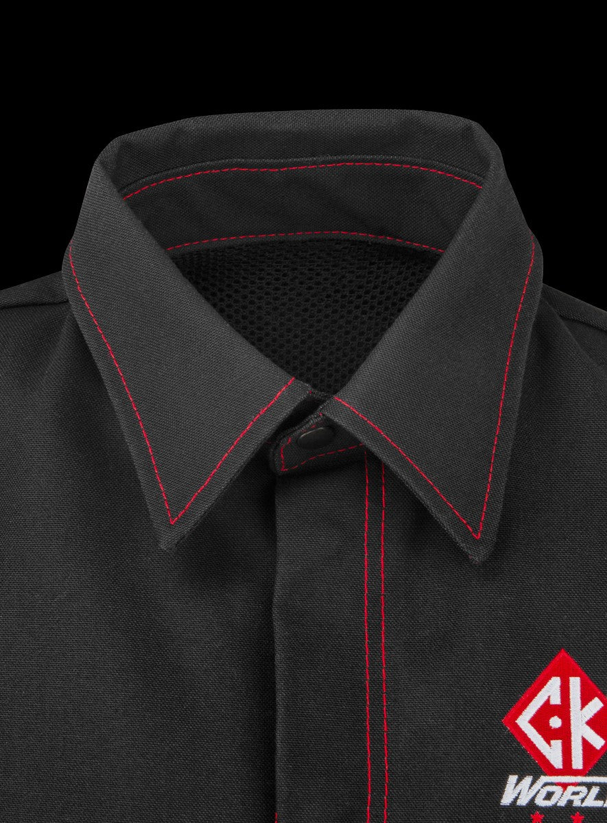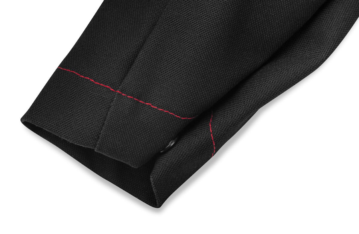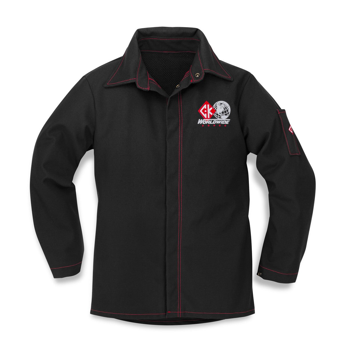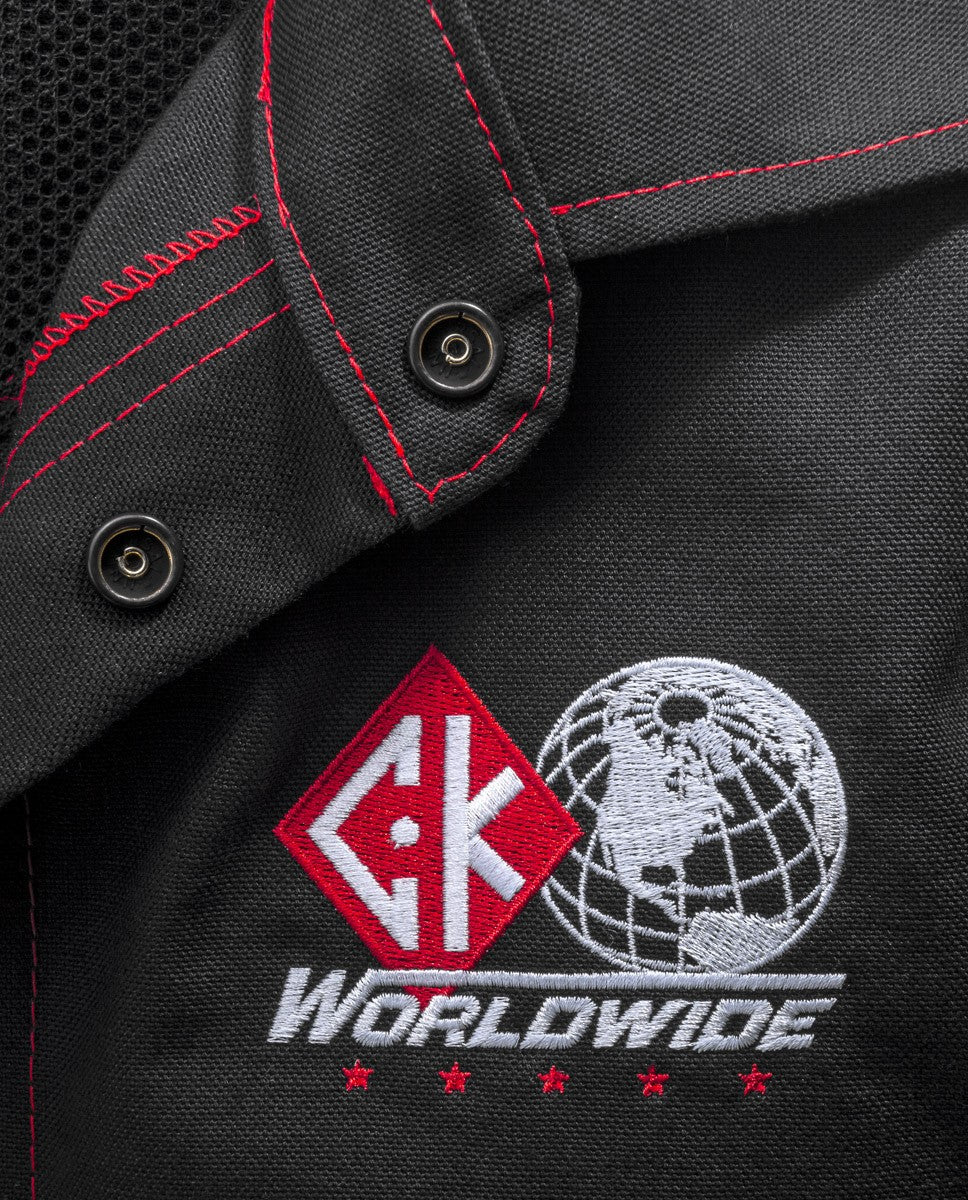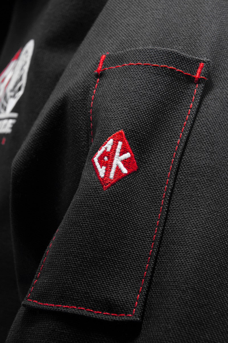 This minimalist jacket design is constructed with North American Mount Vernon Mills Fire Resistant (FR) twill and heavy duty Canadian made FR Kevlar thread in CK red. The jacket is has a tungsten/pen pocket with embroidered CK diamond on the left arm as well as a CK logo on the front left.
